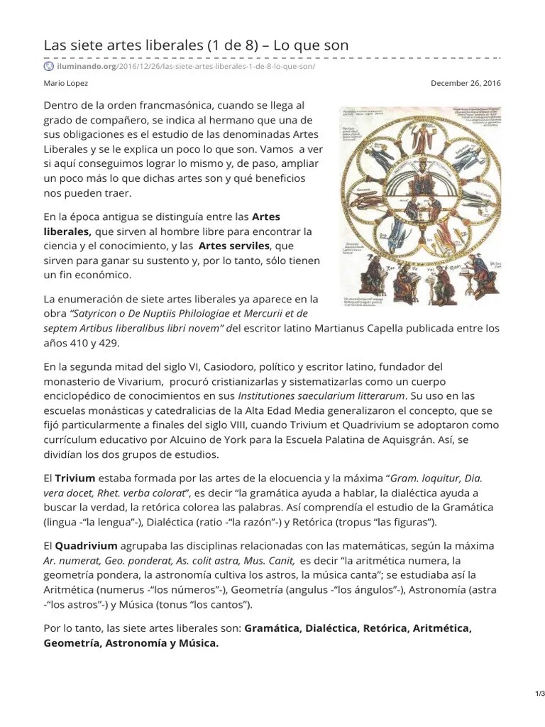 Y le otorgó el don del lenguaje, para cuyo perfeccionamiento existen tres ayudas... Son llamadas liberales (lat.liber, libres) porque sirven al propósito de entrenar al hombre libre, en contraste con las artes illiberales, que. Las artes liberales servían de introducción al estudio de la teología que era su objeto y al cual estaban subordinadas. "dios", dice sanctius, "creó al hombre inteligente, y quiso que fuese un ser social; 04.08.2009 · la eliminación de las artes liberales del estudio está creando una sociedad donde las relaciones interpersonales, el ayudar a los demás, el hablar y debatir de temas que no sean propios de la profesión de uno… carecen de toda importancia. Sólo importa uno mismo y los demás son importantes solo en virtud de cuanto me pueden hacer ganar.. En resumen, la educación moderna está.